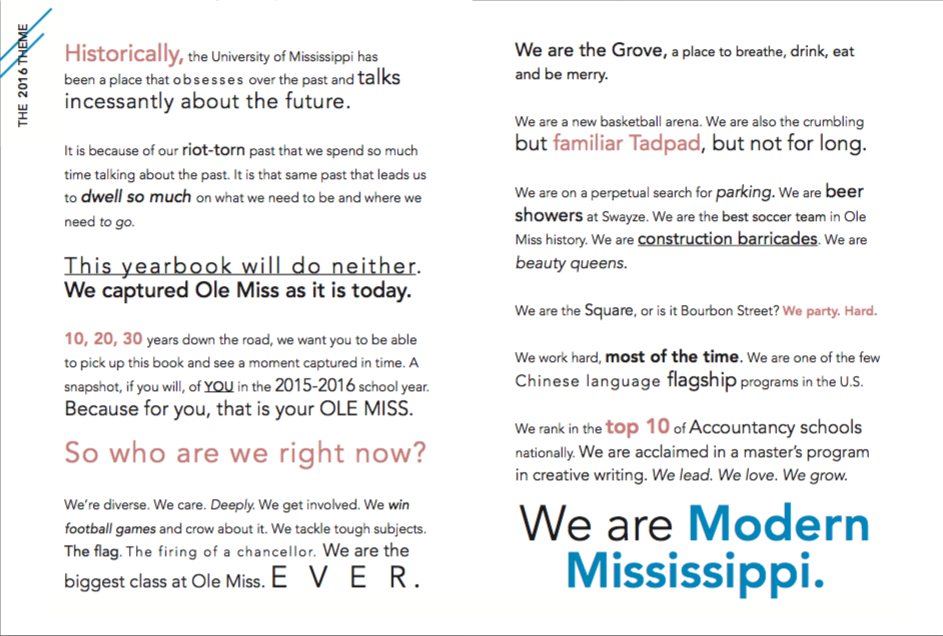 One could say this yearbook is an experiment in which my staff and I work to resolve this conflict. I feel I’ve developed a unique perspective of experience at the University, with six years and two degrees. I’ve witnessed our football team lose to Jacksonville State and then only five years later beat Alabama. I’ve seen the mascot change (by the way, I love Rebel the Black Bear, if you can’t tell). I’ve seen Colonel Rebel change to Mr. Ole Miss. I’ve seen the first black Homecoming Queen. I’ve seen students arrested for hate crimes. I’ve seen enrollment skyrocket and diversity intensify. I rallied for Dan Jones, cried when he left and turned around to welcome Jeff Vitter. Through this yearbook I wanted to identify the complexity that is Ole Miss while simultaneously creating reconciliation.